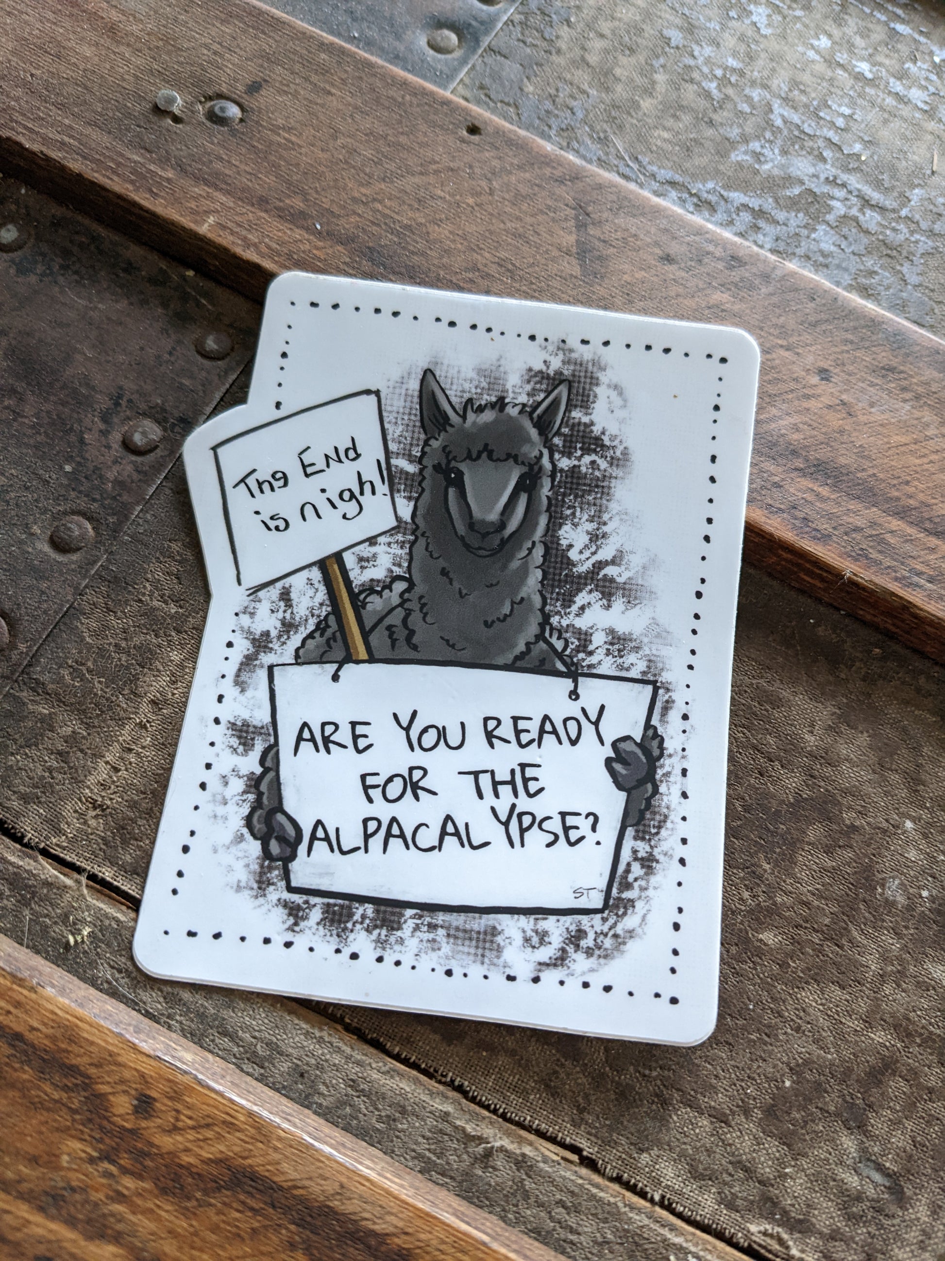 Introducing our quirky "Are you ready for the Alpacalypse?" sticker! This playful design features an adorable alpaca, adding a touch of humor to any surface it graces. Whether you're a fan of puns or just love these fluffy creatures, this sticker is sure to bring a smile to your face. Stick it on your laptop, notebook, or water bottle to showcase your readiness for any alpaca-related adventures that come your way!