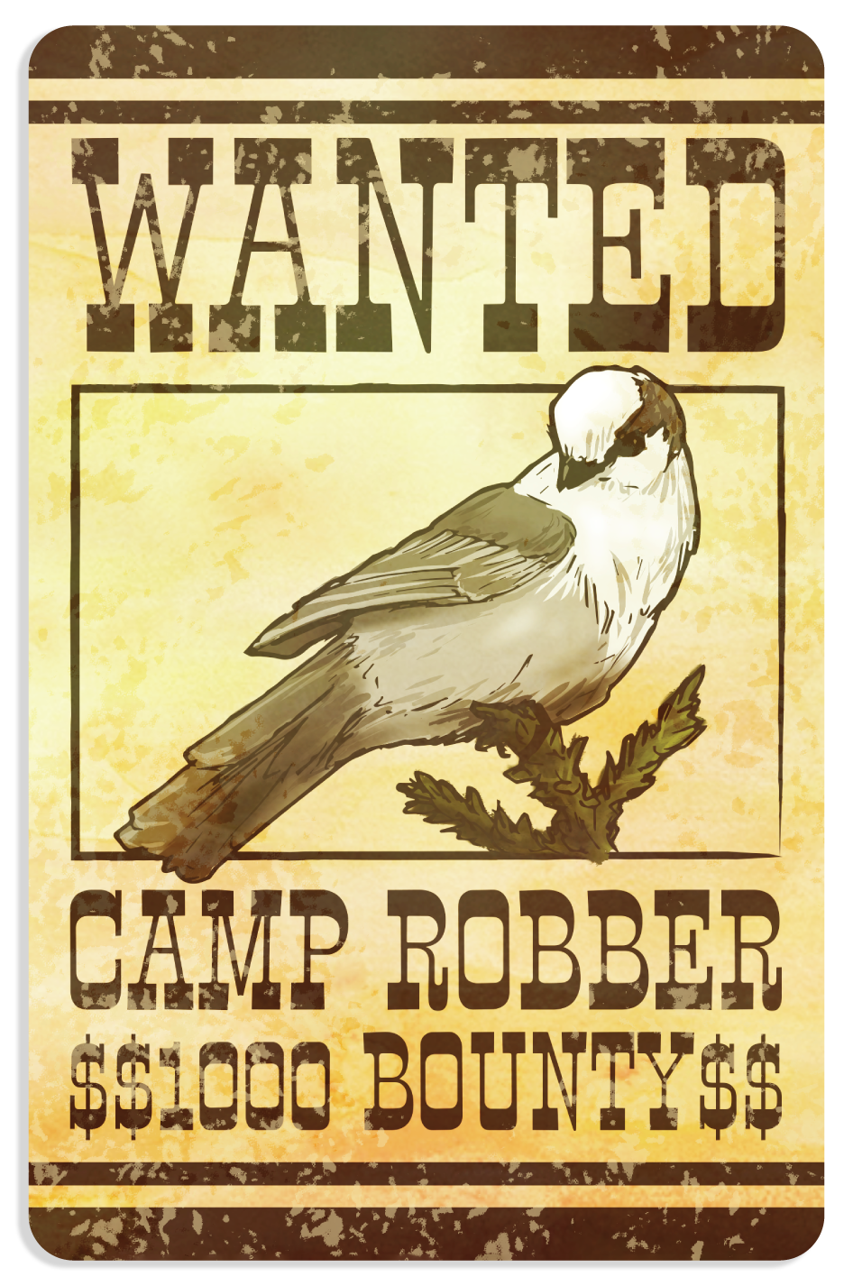 Introducing our unique "Wanted Camp Robber" sticker, designed in classic wanted poster style! Featuring the mischievous Gray Jay, also known as the camp robber, this sticker adds a rustic charm to any surface. Whether you're a nature enthusiast or a camping aficionado, this sticker is a perfect addition to your collection. Stick it on your gear, water bottle, or notebook to showcase your love for these clever birds and add a touch of wilderness flair wherever you go!