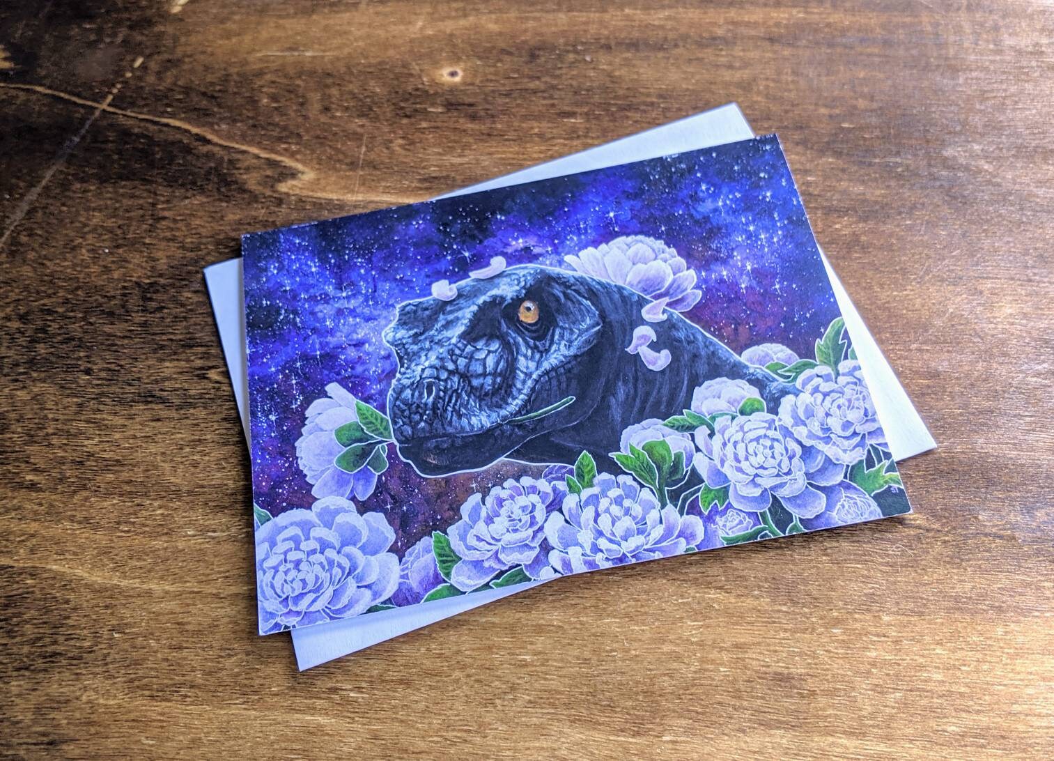 This greeting card features a print of an acrylic painting of a velociraptor and peonies in front of a starry sky.